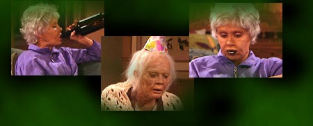 In Beth and her mother's fantasy, Beth is the embodiment of an old maid. She is passing the hours by reading a bridal magazine (which she will clearly never need!), eating junk food, and throwing back drinks! It's not hard to see why Beth is so run down-she is still living with her mother and waiting on her hand and foot! Mrs. Wallace is celebrating her 120th birthday and is still going strong, much to Beth's chagrin!