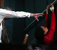 Just after Mrs. Crane's jump, Mr. Hank Bennett and the rescue squad arrived on the scene. But before we could take any action, Mrs. Crane lost hold of the cable she was holding onto and fell on top of the elevator cab. This near-fatal fall was followed by another life-threatening situation as Mr. Winthrop slipped further down the side of the elevator. At this point, Mrs. Crane grabbed hold of him and pulled him on top of the cart.